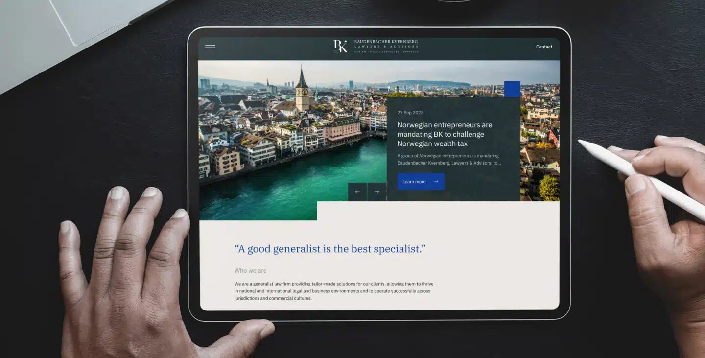 Die Nobel Baudenbacher Anwaltskanzlei fusionierte kürzlich mit renommierten Partnern in Norwegen und Belgien, was zur Gründung von Baudenbacher Kvernberg, Anwälte & Berater, führte. Während diese Fusion eine Fülle von kombinierten Erfahrungen zusammenbrachte, ergab sich auch die Herausforderung, verschiedene Traditionen unter einem einheitlichen digitalen Auftritt zu integrieren.