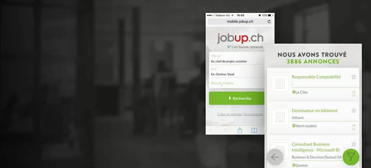 We developed the new mobile site of jobup.ch, the biggest job portal of the French-speaking part of Switzerland. You can search for jobs, set notifications, edit your profile and of course, also apply for jobs. As an extra function, you can also create a CV in PDF with one click, using your profile information.