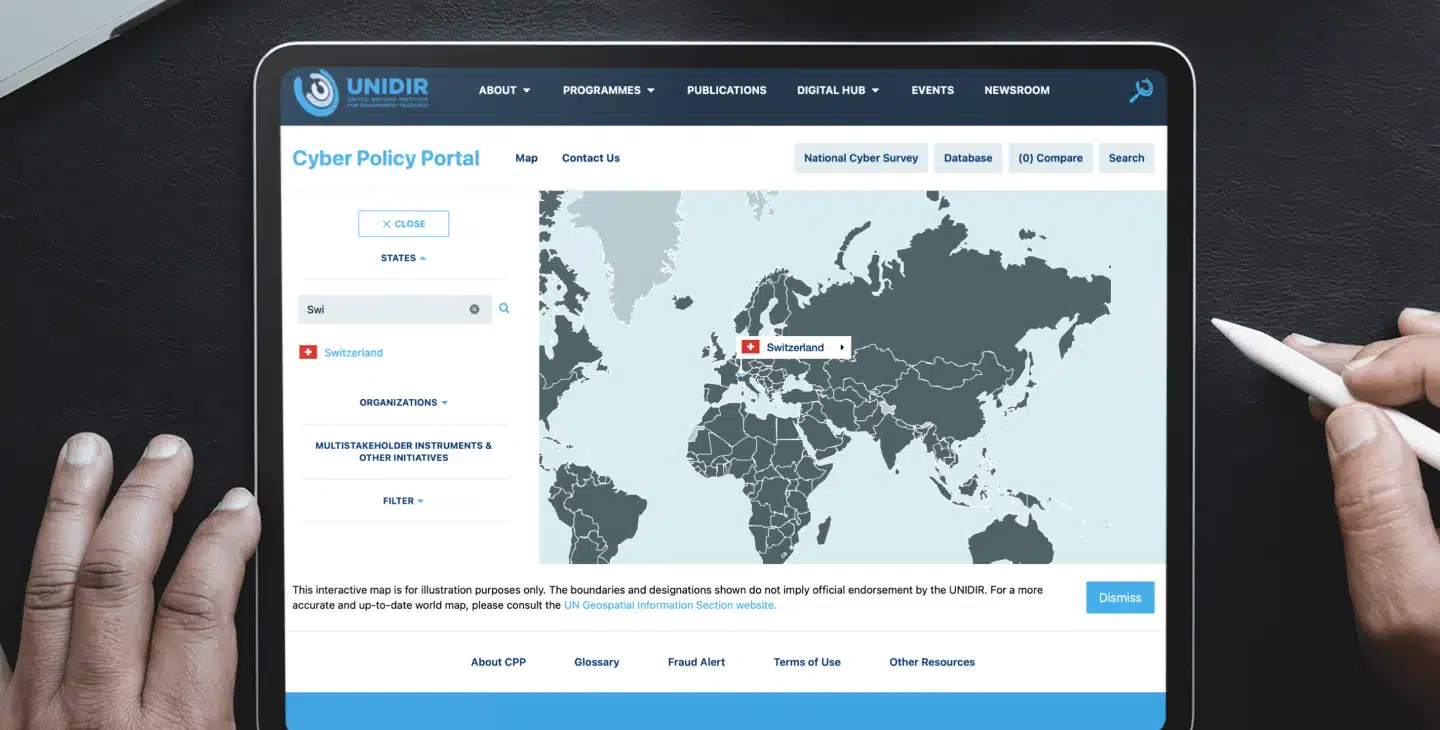 Swiss Tomato, award winning web design agency in Geneva partnered with UNIDIR to develop a cyber policy portal, which consists of a world map, providing profiles of UN Member States and intergovernmental organisations. When a country is selected on the map, users can read their cybersecurity policy, the structure, legal framework, and cooperation. A comparison tool was also developed, so 2 countries can be compared in their cyber policy tools in a user-friendly manner. To facilitate searching for information, filters were also developed with the map, to narrow down what a user may be looking for.
