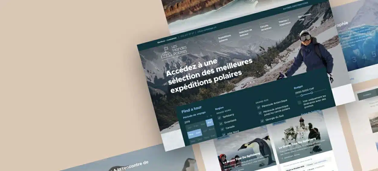 Quoi de plus aventureux que de voyager aux Pôles ? Il a été l’un de nos projets préférés en 2019. Le site devait refléter les nombreuses couleurs de la région et les multiples choix de voyages et de croisières proposés. Nous avons conçu en détail toutes les icônes, filtres, fenêtres popups et champs par catégories pour chaque menu.