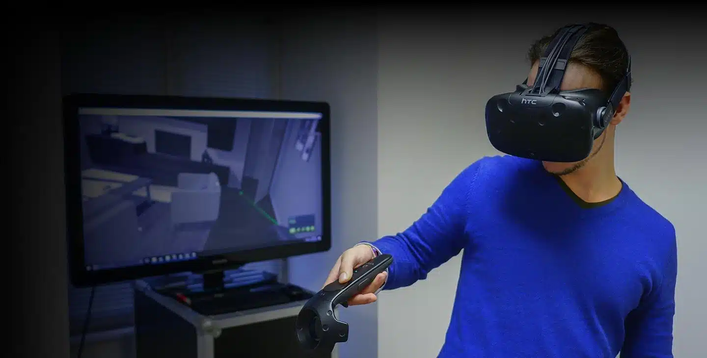 Regardez dans une pièce qui n’existera que dans le futur avec l’aide de lunettes HTC Vive en RV. Promenez-vous dans votre futur bureau ou naviguez dans l’appartement de vos rêves !